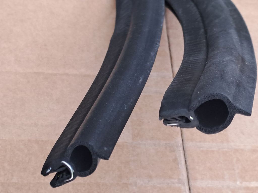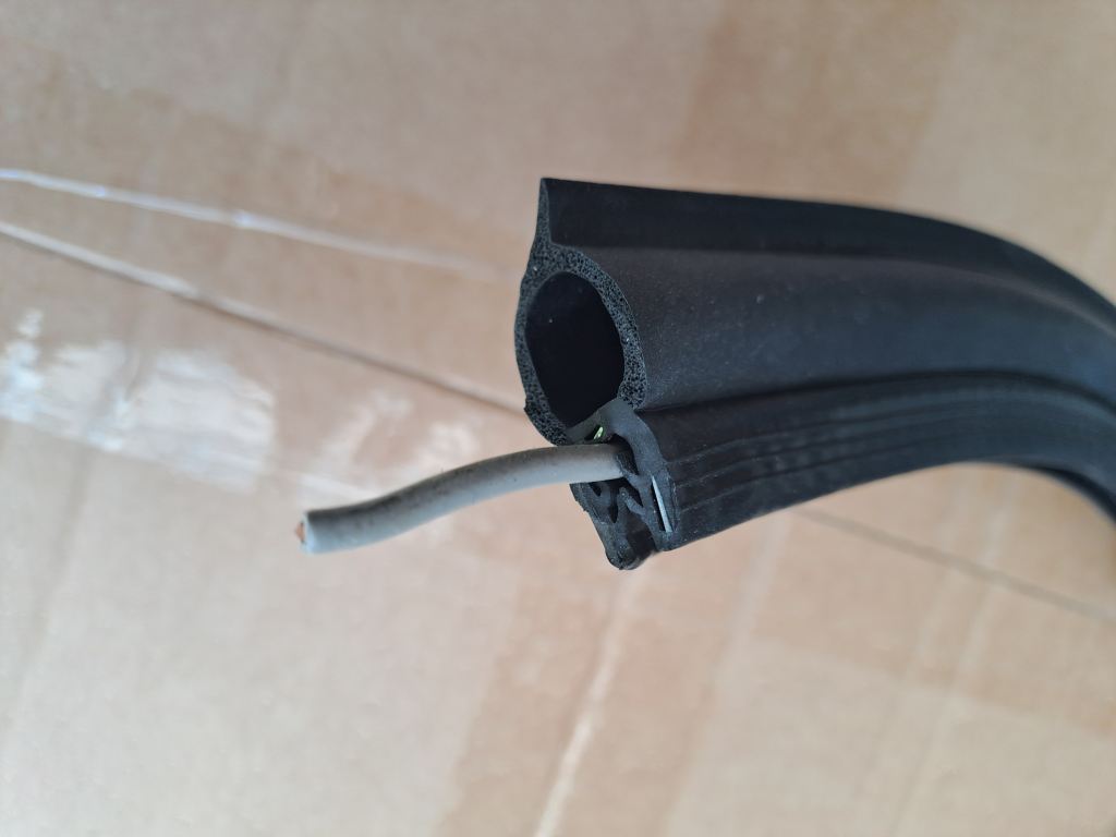 Inzwischen konnten wir die Geräusche durch Austausch der kompletten Dichtung verbannen. Im Internet haben wir den Dichtungsspezialisten SMI aufgetrieben. Eingebaut war das Kantenschutzprofil DO27 (Klemmbereich 1 – 2,5 mm, Dichtkörper 13 x 18 mm). Ersetzt haben wir es durch das nächst größere Profil DO31 (Klemmbereich 1,5 – 3 mm, Dichtkörper 16 x 22,3 mm). Man benötigt 3 m Länge und ca. € 25,- :-). Im unteren Bereich lag auch die neue Dichtung nicht stramm an, so dass wir die Idee mit der untergelegten Kabellitze dort übernommen haben. Jetzt liegt die Dichtung rundherum stramm an, ohne dass die Verriegelungsknebel überlastet werden.
